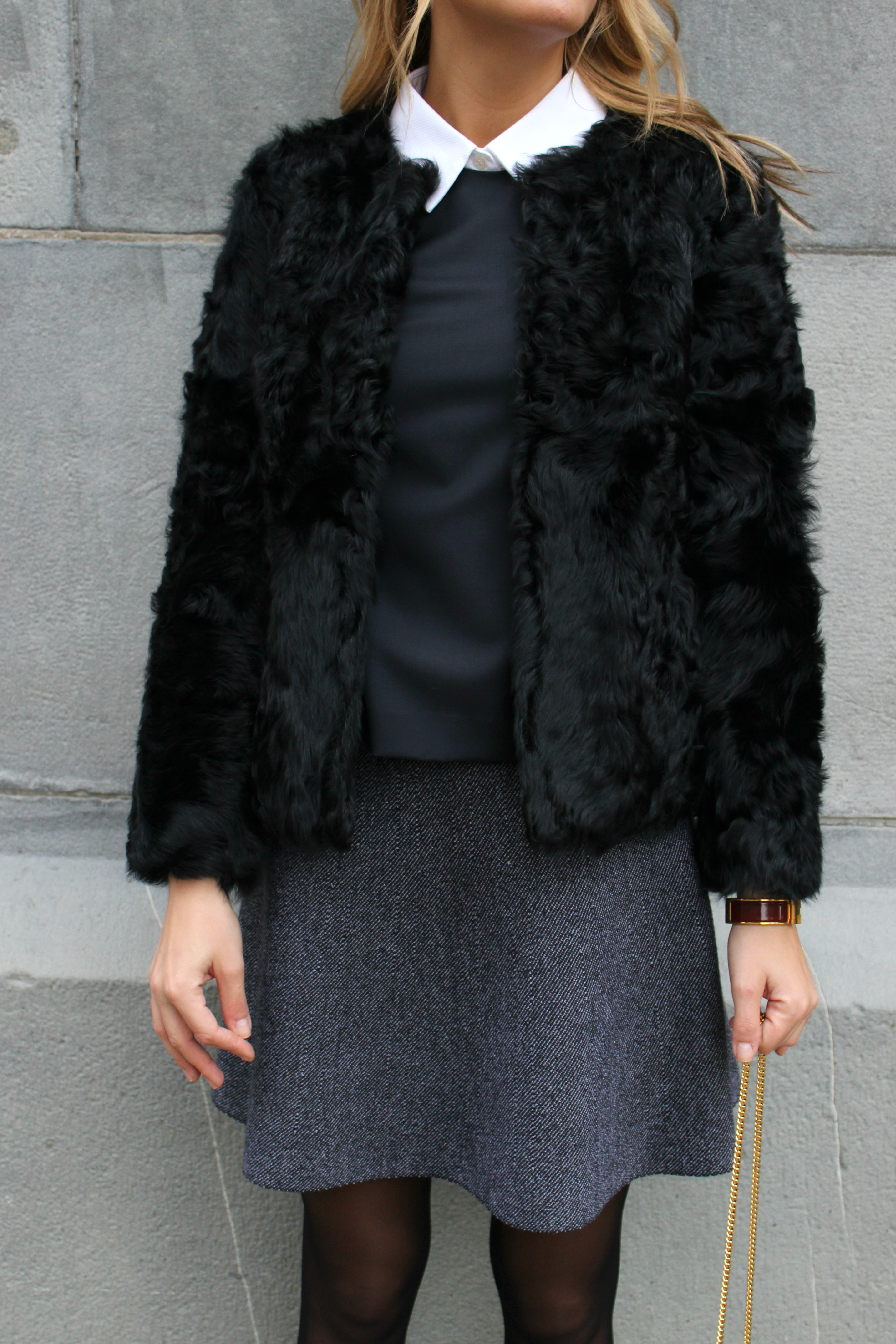 Skjørtet gjør seg utmerket til fest! Silje går for bluse fra Theory, ballerinasko fra Chloé, samt it-vesken Drew som også er fra Chloé. Pelsjakken fra Ravn er en uslåelig favoritt, og vi vet det er mange som venter den i grått. Følg med på Instagram – vi poster når den kommer!