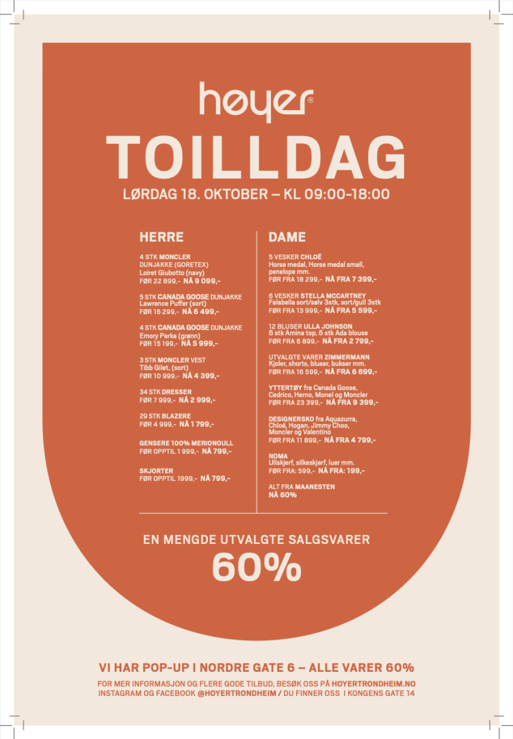 Toilldag nærmer seg med stormskritt, og lørdag 19.oktober braker det løst! Du får blant annet 60% rabatt på et utvalg sko, vesker og klær fra kjente merker som Moncler, Jimmy Choo, Valentino, Chloé, Zimmermann, NN07, Replay, Canada Goose og mange flere! Store deler av avdelingen til både dame og herre er fylt med fantastiske klær…